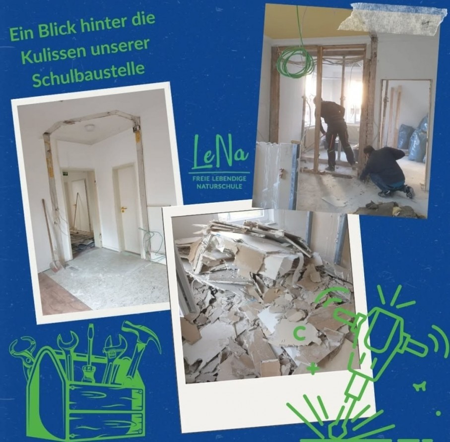 Es geht rund auf unserer Schulbaustelle! Nachdem die Umnutzungsgenehmigung endlich da war, hat sich die Bau - AG gleich an die Arbeit gemacht. Wände wurden rückgebaut und Böden entfernt. Es gibt noch viel zu tun, aber wir sind so glücklich und dankbar über den Einsatz, das Wissen und die tollen Ideen unserer LeNa-Eltern! Bald geht es weiter und wir können es gar nicht mehr erwarten, in dieses wunderschöne LeNa-Zuhause zu ziehen!